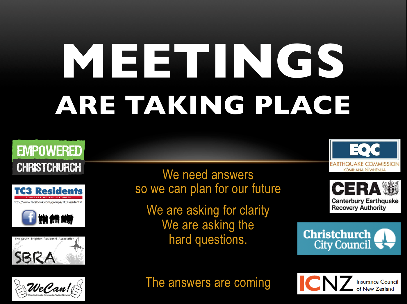 13. EQC has already identified and published these facts and have failed to meet publicly promised deadlines. When will EQC release the people affected whose lives have been on hold for four and a half plus years and when do EQC propose to finally settle the land claims? Communities have experienced more than enough trauma. When will the EQC / Council and CERA omissions cease? When will land owners be truthfully informed, and offered alternative options to relocate or options of proven tested guaranteed durable re-insurable remediation, which will finally assist to ending this man-made suffering bought on by inept policies and procedures which year to date have all failed?